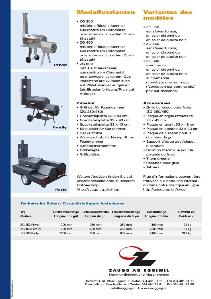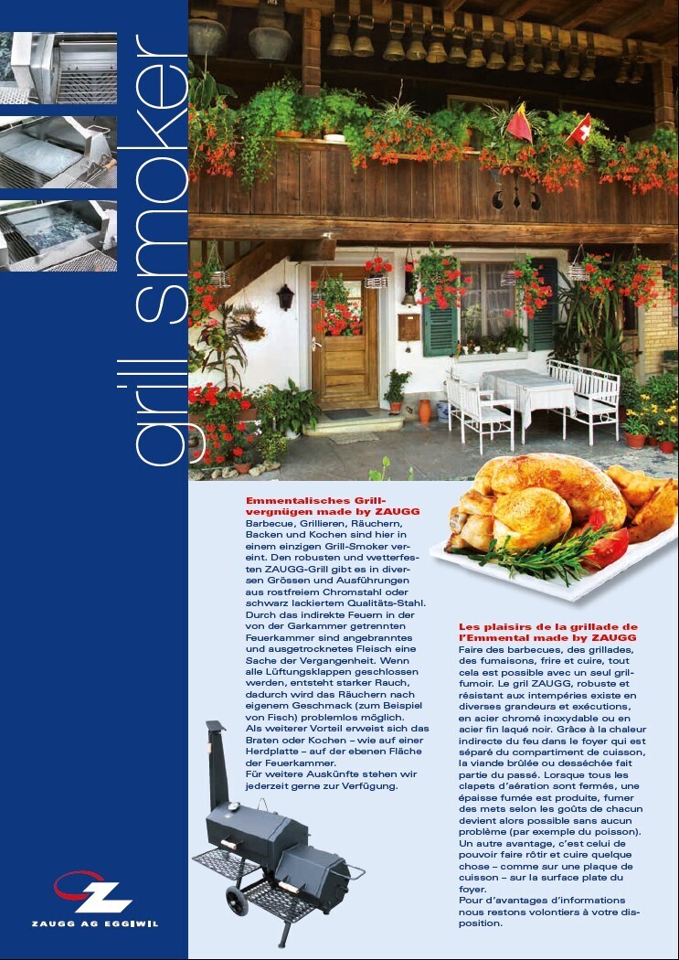 Description: Emmentalisches Grillvergnügen made by ZAUGG Barbecue, Grillieren, Räuchern, Backen und Kochen sind hier in einem einzigen Grill-Smoker vereint. Den robusten und wetterfesten ZAUGG-Grill gibt es in diversen Grössen und Ausführungen aus rostfreiem Chromstahl oder schwarz lackiertem Qualitäts-Stahl. Durch das indirekte Feuern in der von der Garkammer getrennten Feuerkammer sind angebranntes und ausgetrocknetes Fleisch eine Sache der Vergangenheit. Wenn alle Lüftungsklappen geschlossen werden, entsteht starker Rauch, dadurch wird das Räuchern nach eigenem Geschmack (zum Beispiel von Fisch) problemlos möglich. Als weiterer Vorteil erweist sich das Braten oder Kochen – wie auf einer Herdplatte – auf der ebenen Fläche der Feuerkammer. Für weitere Auskünfte stehen wir jederzeit gerne zur Verfügung.